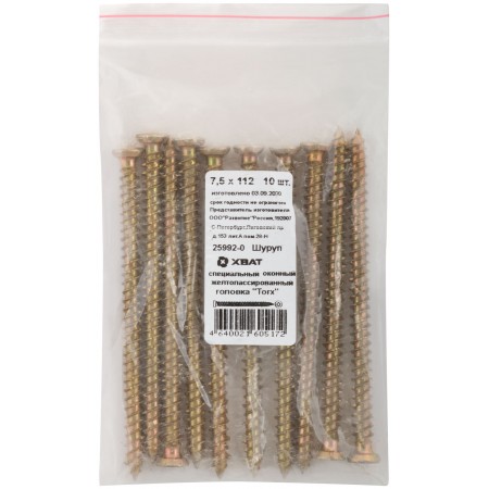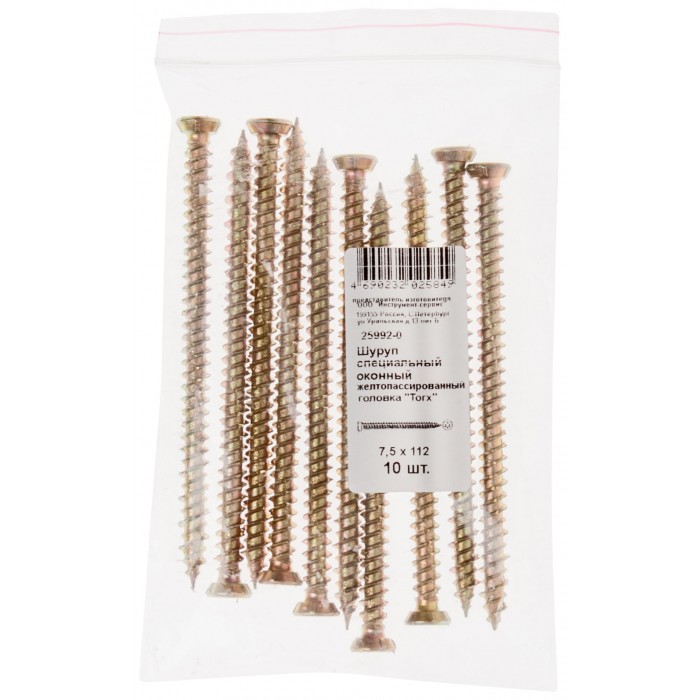 Шуруп специальный/окон, желтопассированный, головка "Torx", 7,5 х 112, 10 шт Фасовка (25992-0)