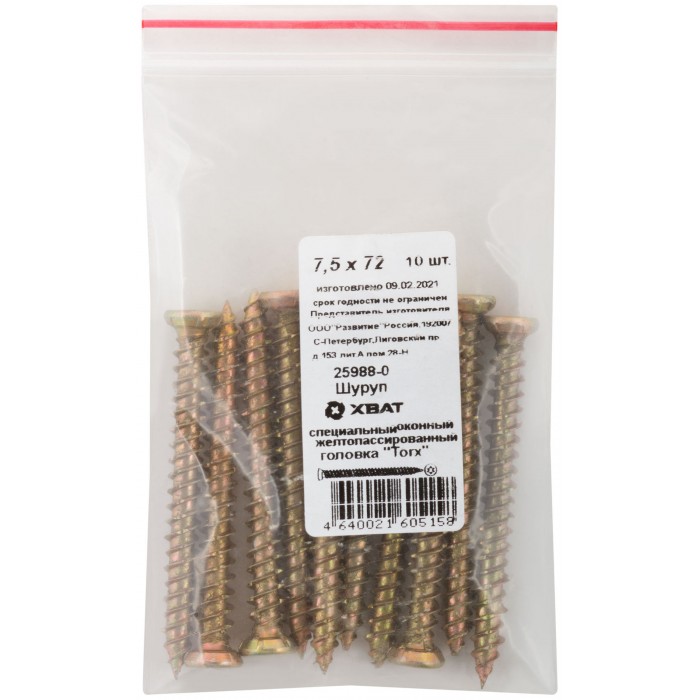 Шуруп специальный/окон, желтопассированный, головка "Torx", 7,5 х 72, 10 шт. Фасовка (25988-0)