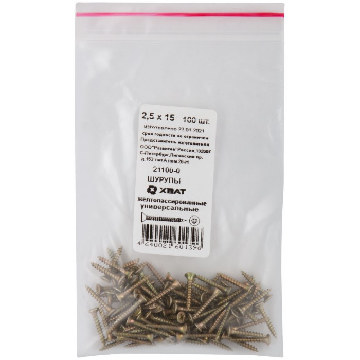 Шурупы желтопассированные, универсальные 2,5 х 15 100 шт Фасовка (21100-0)