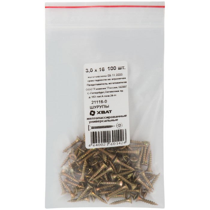 Шурупы желтопассированные, универсальные 3 х 16 100 шт Фасовка (21116-0)