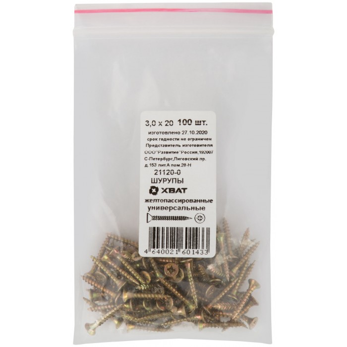 Шурупы желтопассированные, универсальные 3 х 20 100 шт Фасовка (21120-0)