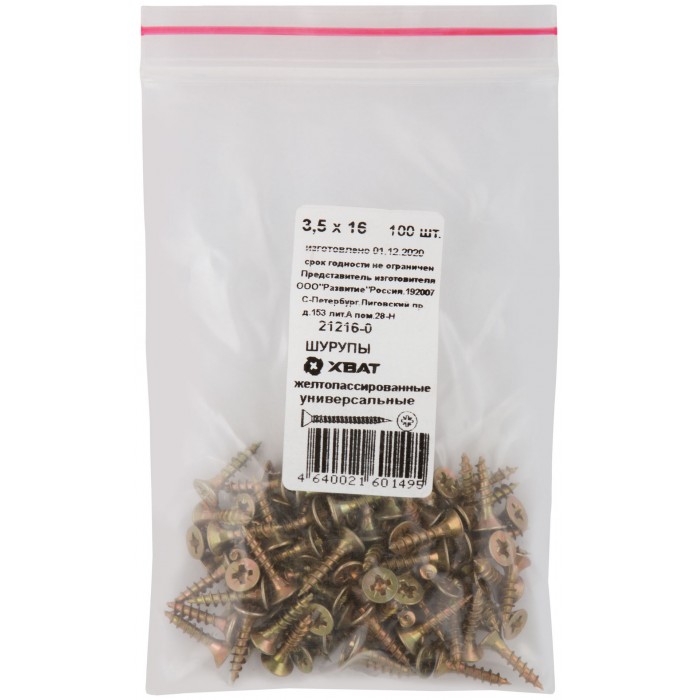 Шурупы желтопассированные, универсальные 3,5 х 16 100 шт Фасовка (21216-0)