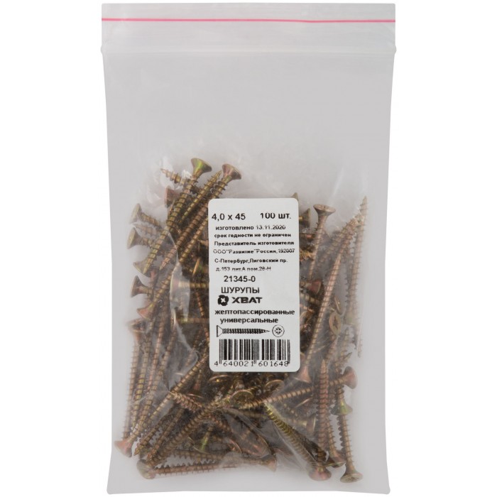 Шурупы желтопассированные, универсальные 4 х 45 100 шт Фасовка (21345-0)