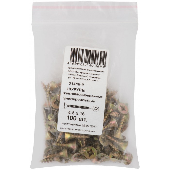 Шурупы желтопассированные, универсальные 4,5 х 16 100 шт Фасовка (21416-0)