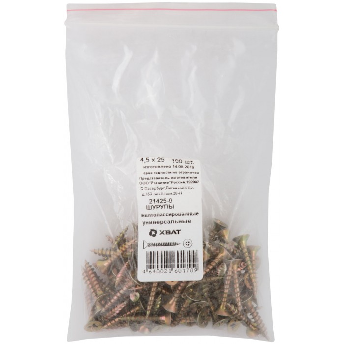 Шурупы желтопассированные, универсальные 4,5 х 25 100 шт Фасовка (21425-0)