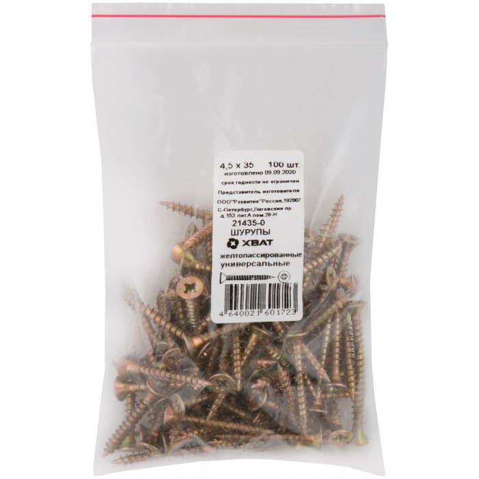 Шурупы желтопассированные, универсальные 4,5 х 35 100 шт Фасовка (21435-0)