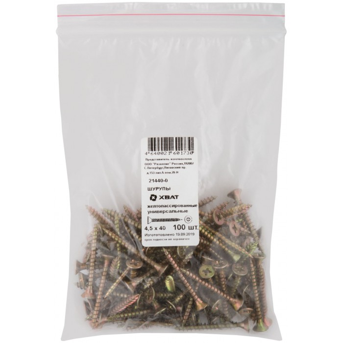 Шурупы желтопассированные, универсальные 4,5 х 40 100 шт Фасовка (21440-0)