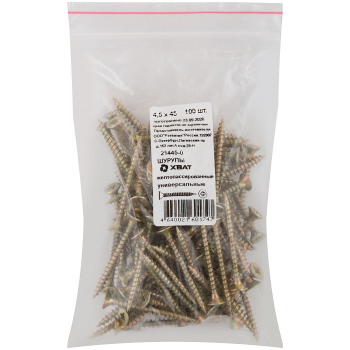 Шурупы желтопассированные, универсальные 4,5 х 45 100 шт Фасовка (21445-0)