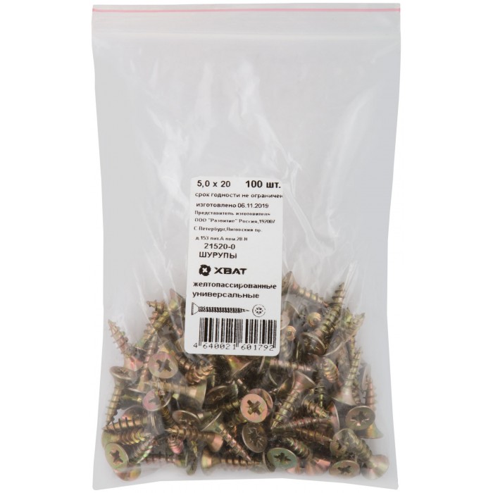 Шурупы желтопассированные, универсальные 5 х 20 100 шт Фасовка (21520-0)