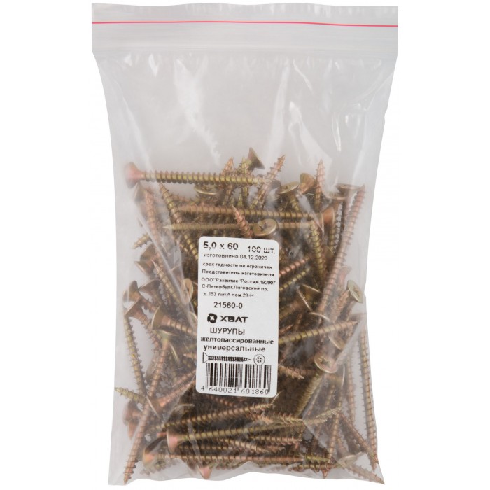 Шурупы желтопассированные, универсальные 5 х 60 100 шт Фасовка (21560-0)
