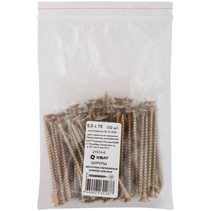 Шурупы желтопассированные, универсальные 5 х 70 100 шт Фасовка (21570-0)