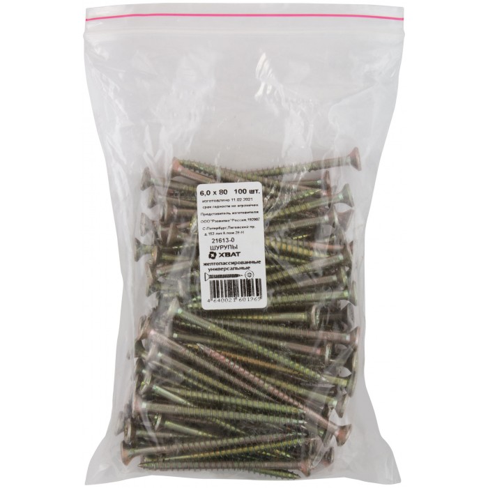Шурупы желтопассированные, универсальные 6 х 80 100 шт Фасовка (21613-0)