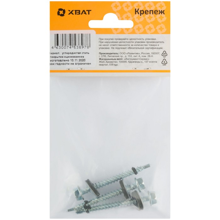 Некрашеный, с прорезиненной шайбой EPDM. Предназначен для крепления кровельных и фасадных материалов к деревянной обрешетке. Частый шаг резьбы, наконечник сверло №2. Изготовлен из углеродистой стали, покрытие - белый цинк.