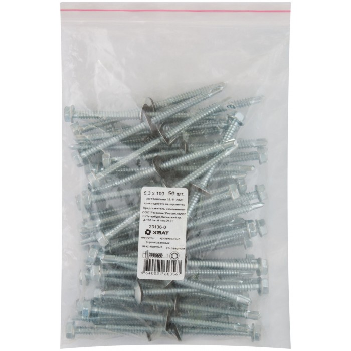 Шурупы кровельные оцинк. некрашеные, со сверлом М6,3 х 100 50шт. Фасовка (23136-0)
