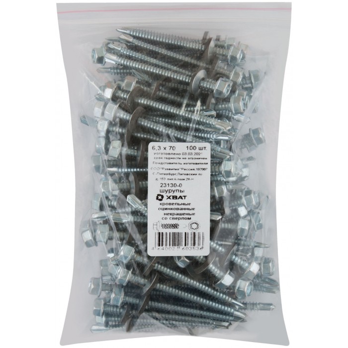Шурупы кровельные оцинк. некрашеные, со сверлом М6,3 х 70 100шт. Фасовка (23130-0)