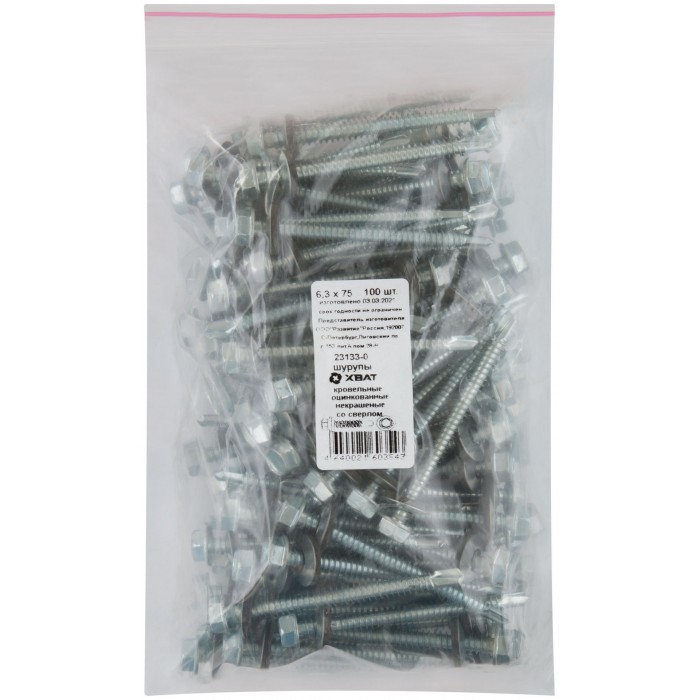 Шурупы кровельные оцинк. некрашеные, со сверлом М6,3 х 75 100шт. Фасовка (23133-0)