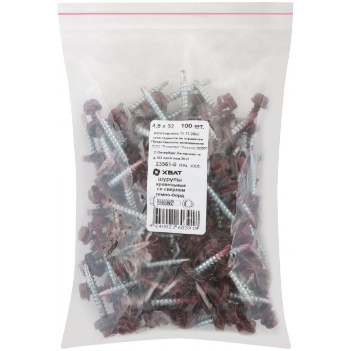 Шурупы кровельные со сверлом 4.8 х 32, темно-борд. RAL-3005 100шт. Фасовка (23561-0)