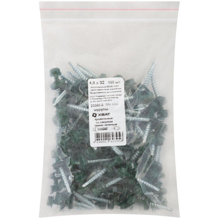 Шурупы кровельные со сверлом 4.8 х 32, темно-зеленый RAL-6005 100шт. Фасовка (23565-0)
