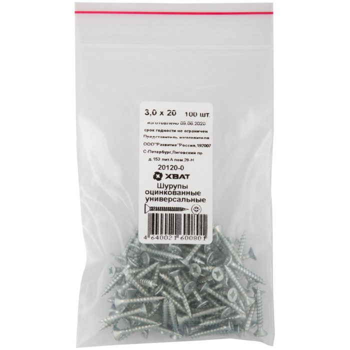 Шурупы оцинкованные, универсальные 3 х 20 100 шт Фасовка (20120-0)