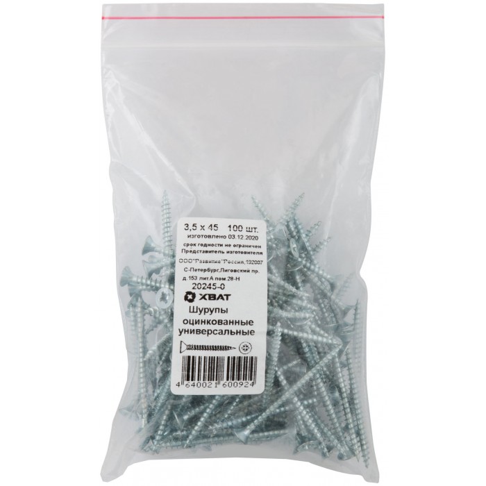 Шурупы оцинкованные, универсальные 3,5 х 45 100 шт Фасовка (20245-0)