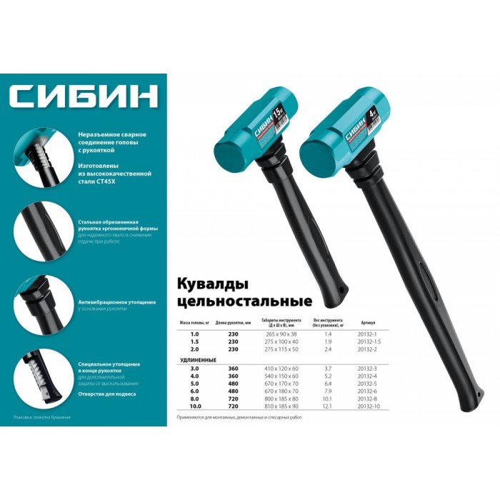 Цельностальная кувалда с удлинённой обрезиненной рукояткой 10 кг 720 мм СИБИН 20132-10