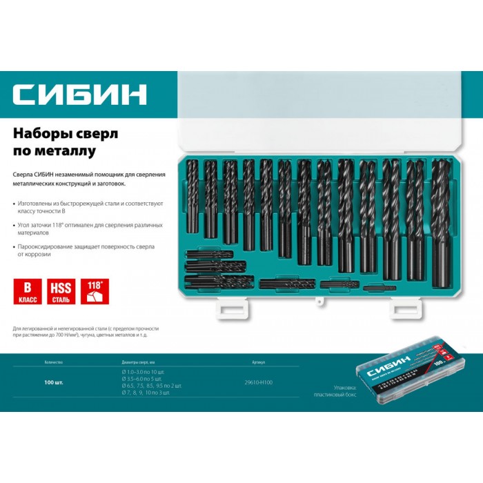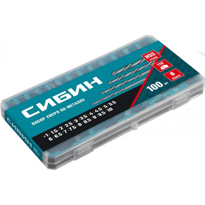 Набор сверл по металлу 100 шт 1-10 мм быстрорежущая сталь класс В пласт.бокс СИБИН 29610-H100