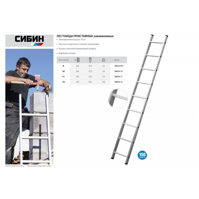 Лестница приставная односекционная алюминиевая 11 ступеней, высота 307 см СИБИН 38834-11