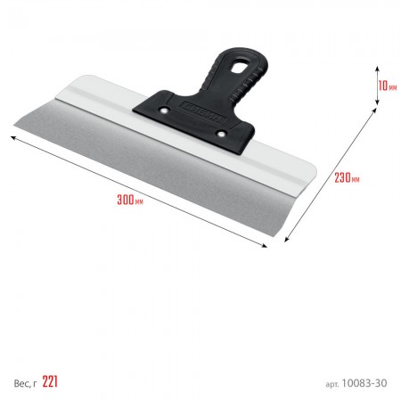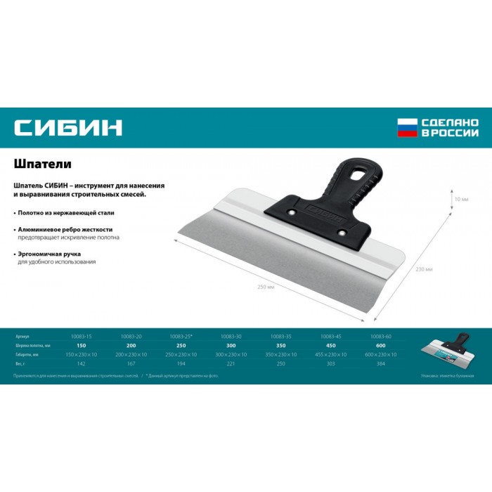 Шпатель СИБИН - отличный выбор для строительства и ремонта! Полотно из нержавеющей стали обеспечивает надежность и долгий срок службы инструмента, алюминиевая направляющая предотвращает изгиб полотна, а эргономичная однокомпонентная рукоятка создает условия для комфортной работы.