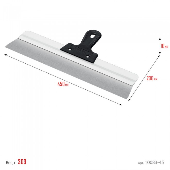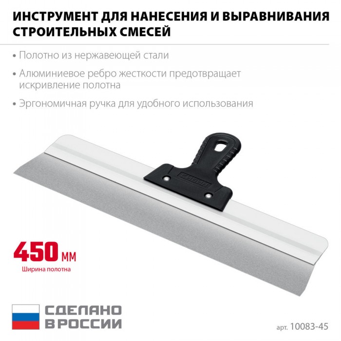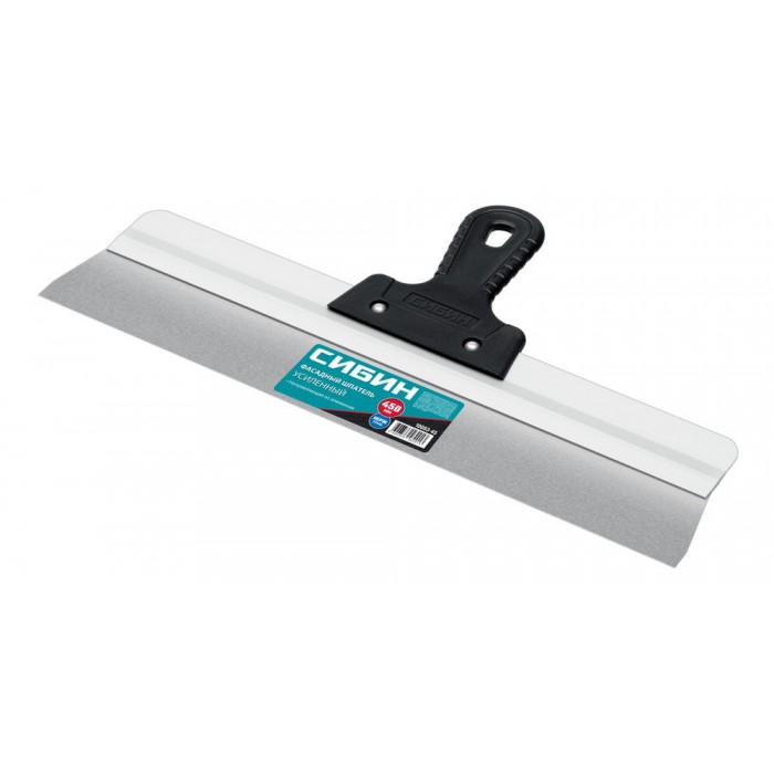 Шпатель СИБИН - отличный выбор для строительства и ремонта! Полотно из нержавеющей стали обеспечивает надежность и долгий срок службы инструмента, алюминиевая направляющая предотвращает изгиб полотна, а эргономичная однокомпонентная рукоятка создает условия для комфортной работы.