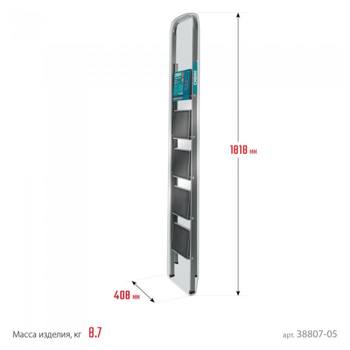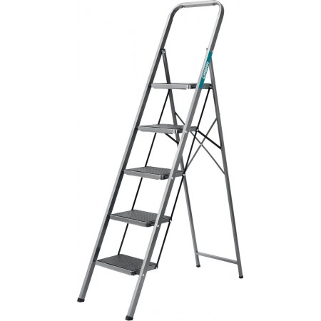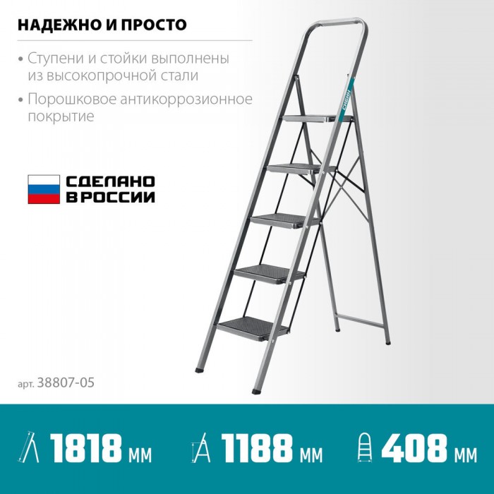Стальная стремянка 5 ступеней 118 см c широкими обрезиненными ступенями СИБИН 38807-05