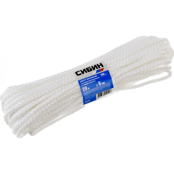 Полипропиленовый шнур 6 мм 20 м вязаный с сердечником белый СИБИН 50256