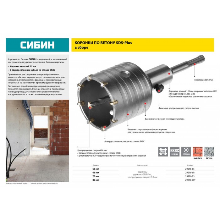Применяется для сверления легкого бетона и кирпича. Используется с дрелями и перфораторами мощностью не менее 850 Вт в режиме ударного сверления.