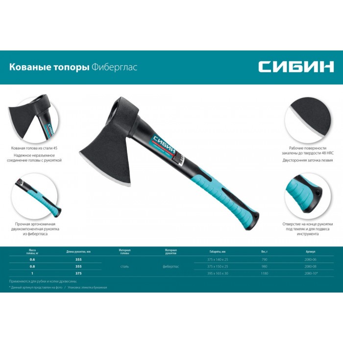 Кованый топор 800/980 г 380 мм СИБИН Фибергласс 2080-08