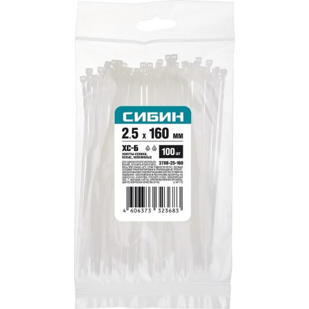 Хомуты-стяжки белые 2.5 x 160 мм нейлон РА66 100 шт СИБИН ХС-Б 3786-25-160