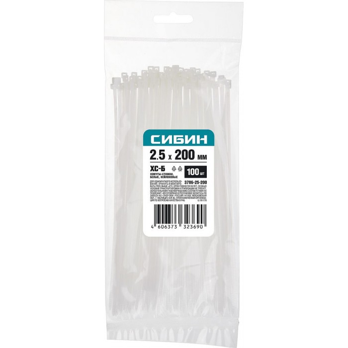 Хомуты-стяжки белые 2.5 x 200 мм нейлон РА66 100 шт СИБИН ХС-Б 3786-25-200