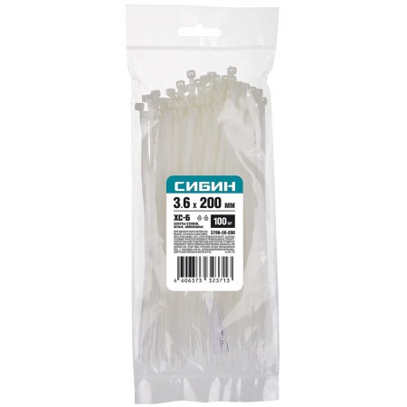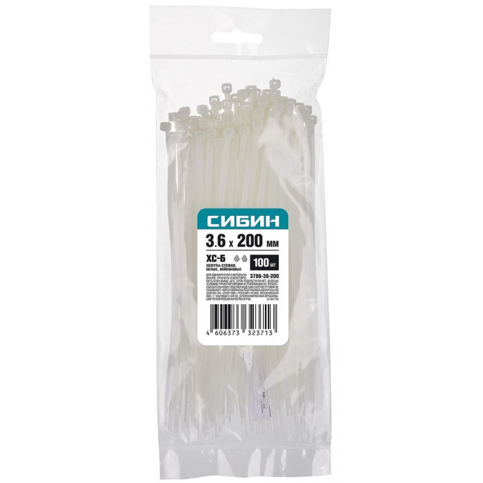 Хомуты-стяжки белые 3.6 x 200 мм нейлон РА66 100 шт СИБИН ХС-Б 3786-36-200