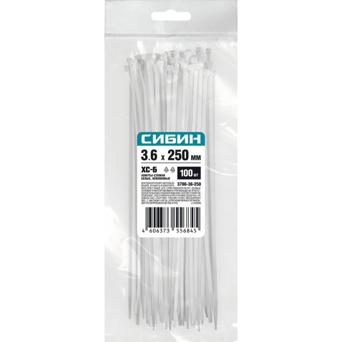 Хомуты-стяжки белые 3.6 x 250 мм нейлон РА66 100 шт СИБИН ХС-Б 3786-36-250