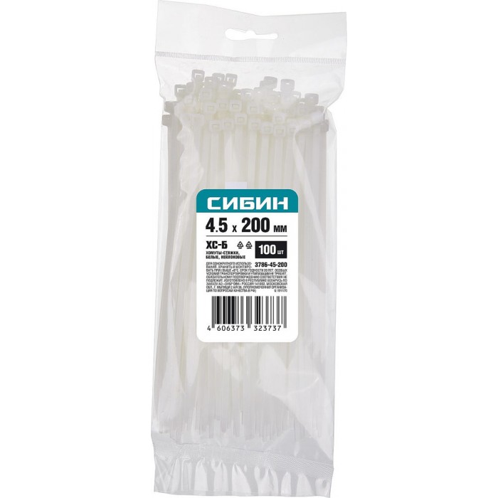 Хомуты-стяжки белые 4.5 x 200 мм нейлон РА66 100 шт СИБИН ХС-Б 3786-45-200
