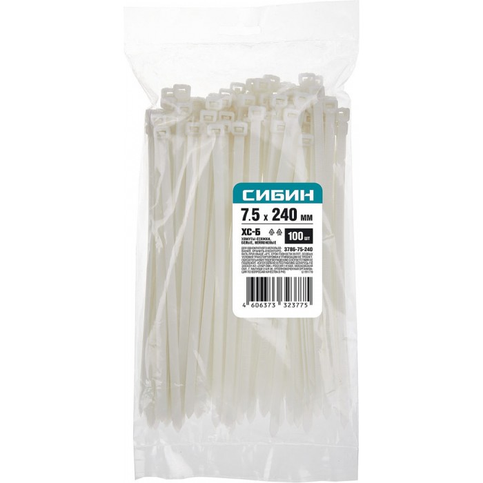 Хомуты-стяжки белые 7.5 x 240 мм нейлон РА66 100 шт СИБИН ХС-Б 3786-75-240