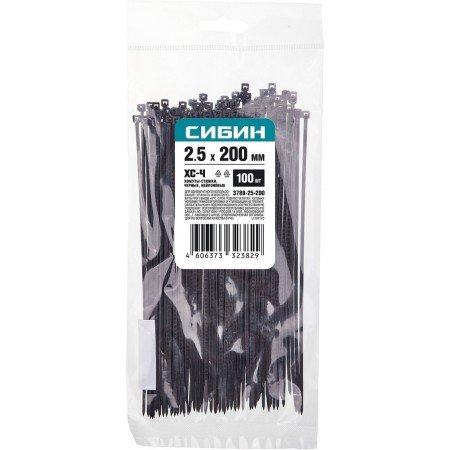 Хомуты-стяжки черные 2.5 x 200 мм нейлон РА66 100 шт СИБИН ХС-Ч 3788-25-200