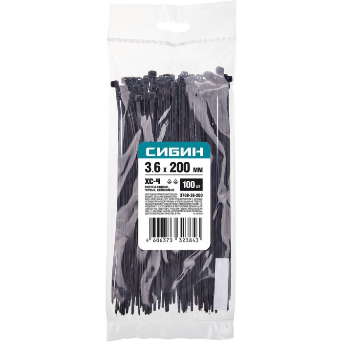 Хомуты-стяжки черные 3.6 x 200 мм нейлон РА66 100 шт СИБИН ХС-Ч 3788-36-200