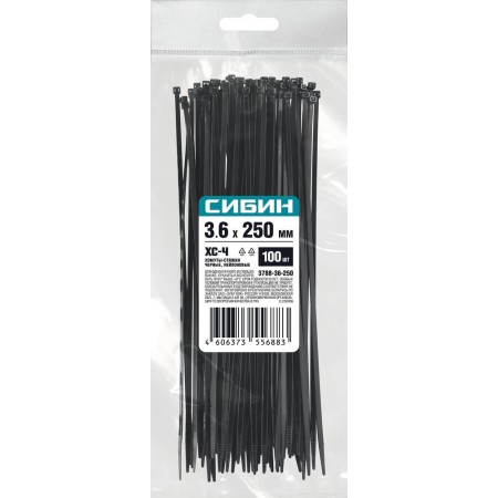 Хомуты-стяжки черные 3.6 x 250 мм нейлон РА66 100 шт СИБИН ХС-Ч 3788-36-250