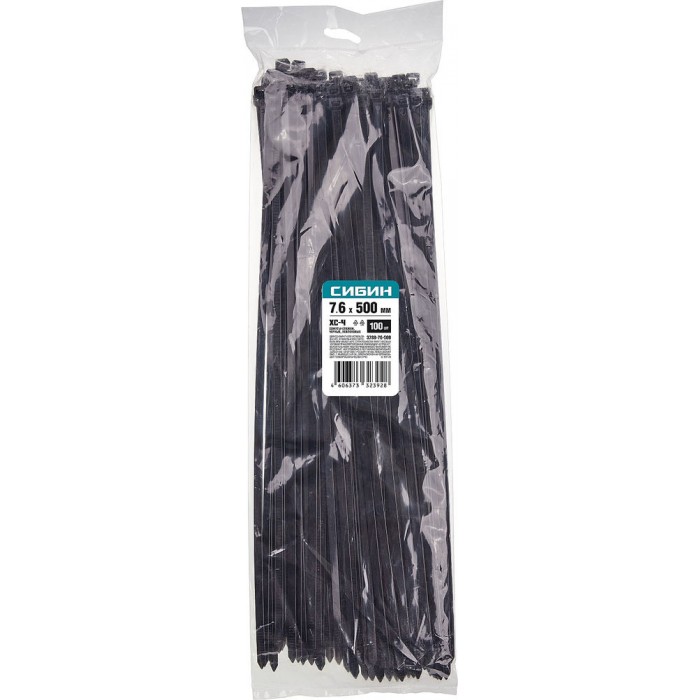 Хомуты-стяжки черные 7.6 x 500 мм нейлон РА66 100 шт СИБИН ХС-Ч 3788-76-500