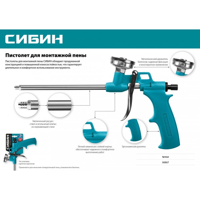 Применяется для нанесения полиуретановой пены, упакованной в баллоны.