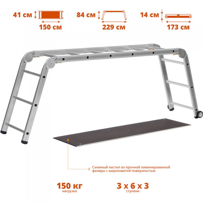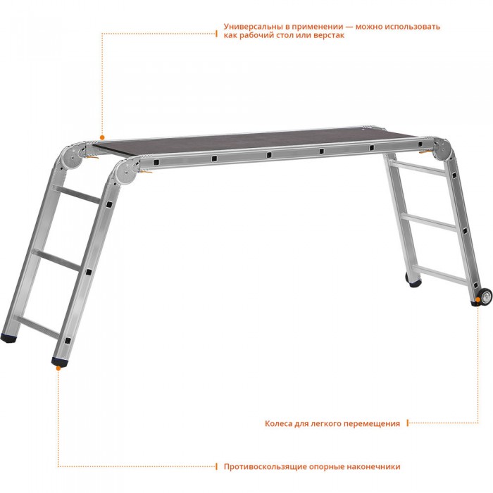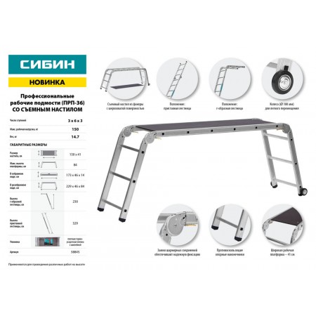 Лестницы СИБИН предназначена для выполнения различных хозяйственных работ. Надежная конструкция в сочетании с высококачественными материалами обеспечивают легкость и удобство в эксплуатации.