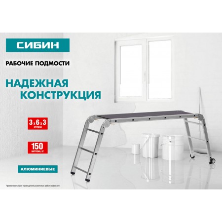 Складные алюминиевые парофессиональные рабочие подмости с колесами и съемной площадкой 3 х 6 х 3 ступени СИБИН ПРП-36 38845