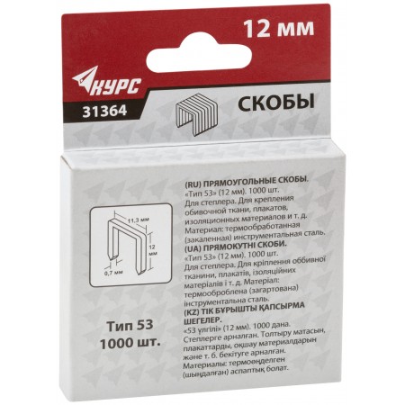 Скобы для степлера закаленные 11,3 мм х 0,7 мм, (узкие тип 53) 12 мм, 1000 шт. (31364)