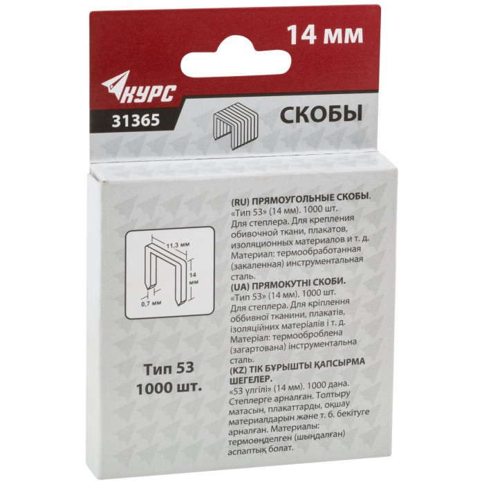 Скобы для степлера закаленные 11,3 мм х 0,7 мм, (узкие тип 53) 14 мм, 1000 шт. (31365)