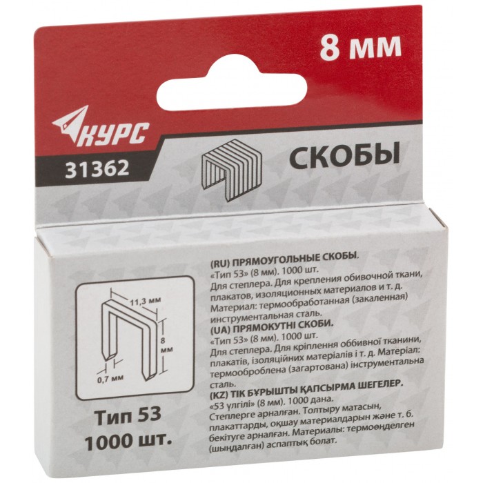 Скобы для степлера закаленные 11,3 мм х 0,7 мм, (узкие тип 53) 8 мм, 1000 шт. (31362)