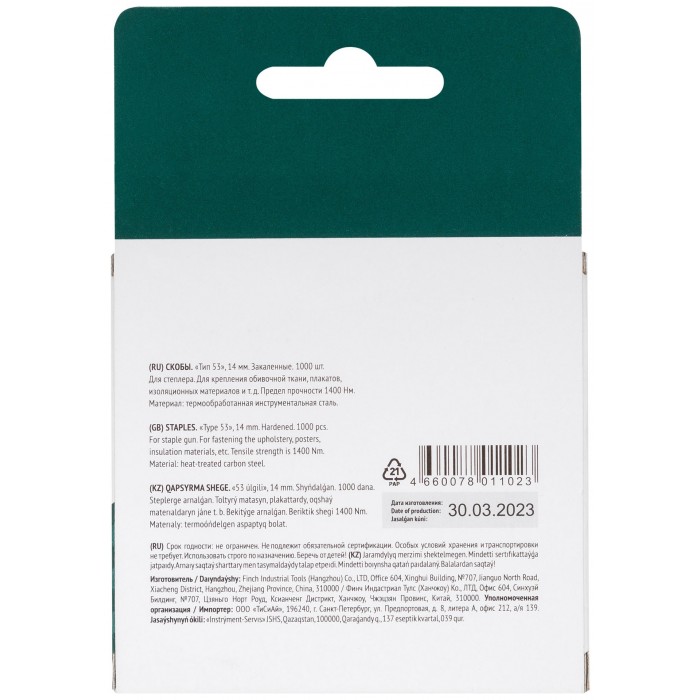 «Тип 53». Профи. Узкие, прямоугольные, калёные. Ширина 11,3 мм. Для степлеров 32081, 32084, 32086, 32095, 32104, 32114, 32120, 32123, 32135, 32145. Упаковка: коробка с подвесом.